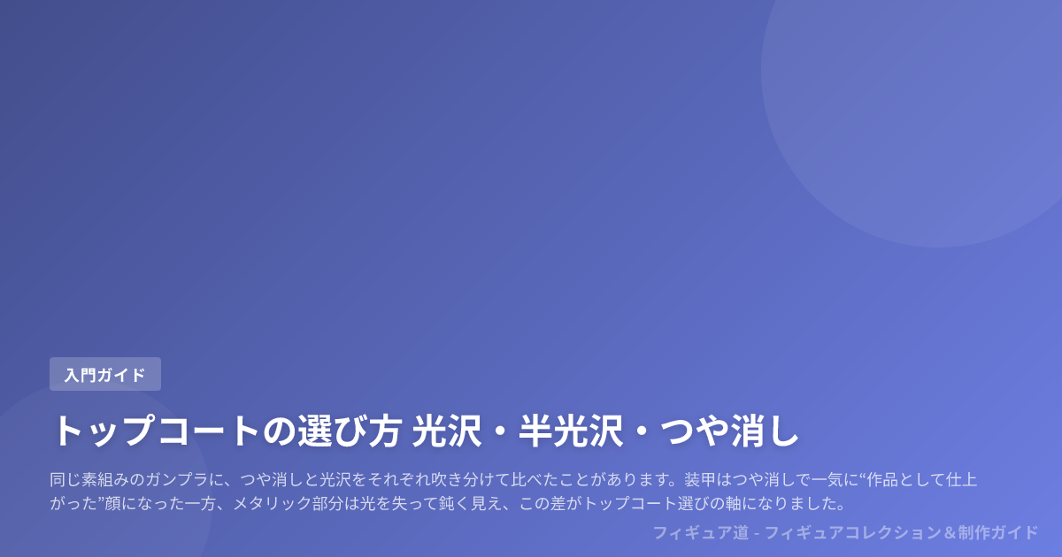 この記事は、フィギュアやプラモデルの仕上げで迷いがちな人に向けて、光沢・半光沢・つや消しの見え方と使い分けを、作品タイプごとに整理する内容です。