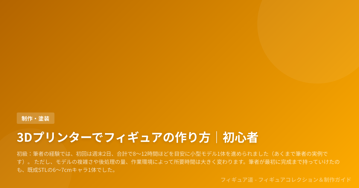 初級:筆者の経験では、初回は週末2日、合計で8〜12時間ほどを目安に小型モデル1体を進められました(あくまで筆者の実例です)。 ただし、モデルの複雑さや後処理の量、作業環境によって所要時間は大きく変わります。